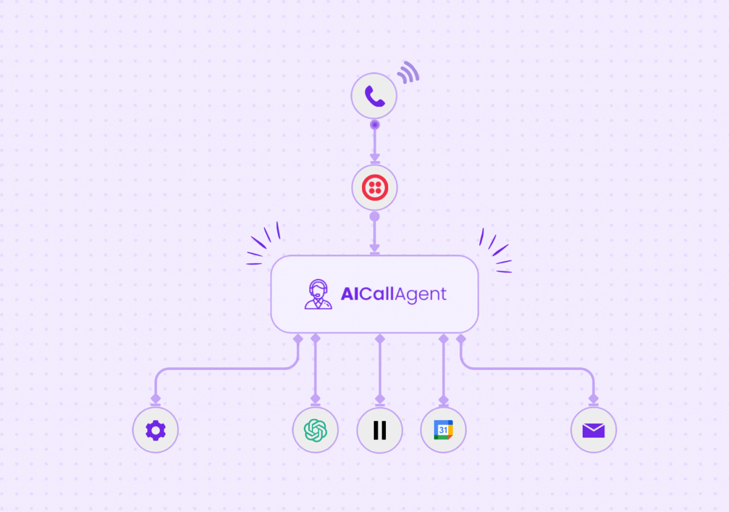 AIcallAgent connects speech-to-text, custom LLM intelligence, and lifelike AI voices into one seamless workflow-